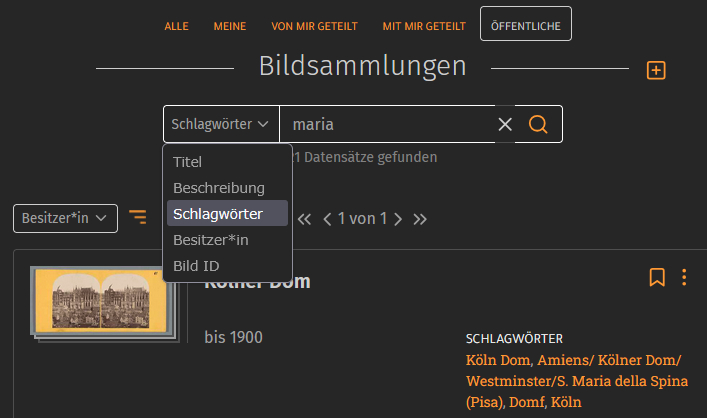 Wenn Sie übrigens eines der Schlagwörter anklicken, das einer Bildsammlung zugeordnet wurde, werden Ihnen direkt alle Bildsammlungen angezeigt, die mit diesem Begriff verschlagwortet wurden.