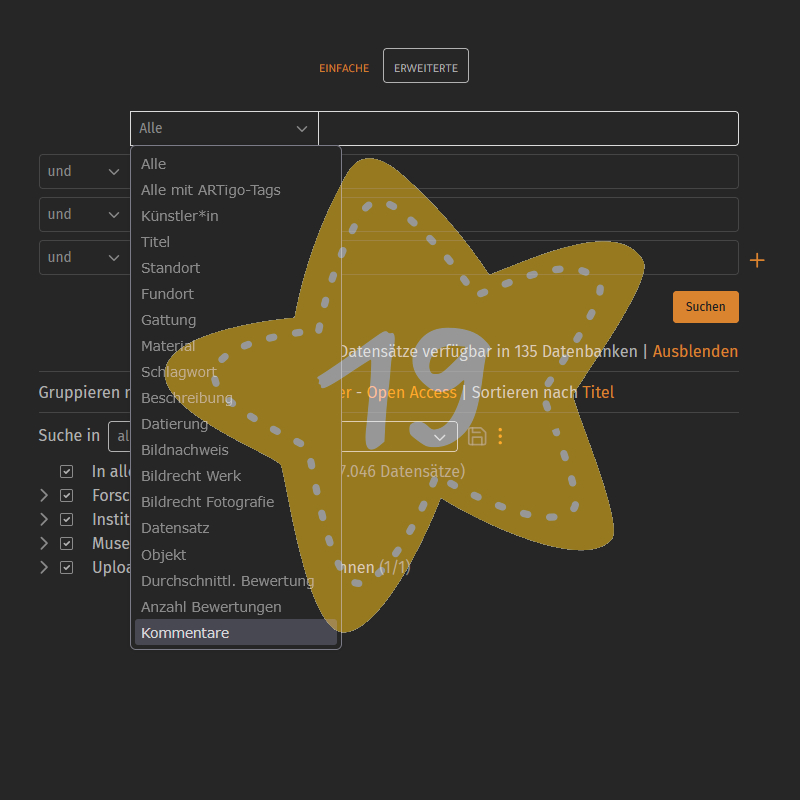 In the advanced search, you can search in 19 categories, starting with ‘all’ (1) as in the simple search. You can also select