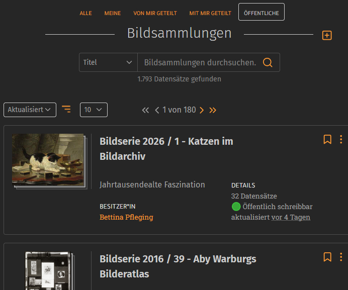 Of the currently 51,085 image collections in prometheus, 1,793 image collections are public. This means that they can be seen by everyone who has access to the image archive and, in some cases, can also be edited if the owners of these image collections have activated the “writable” setting. Select “public” and they will be displayed to you, here sorted by “updated on”: